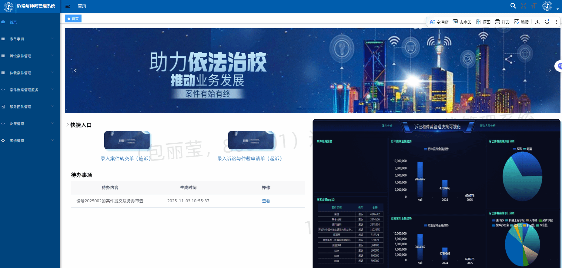 为学校诉讼与仲裁案件提供全流程信息化管理支持,主要功能包括,1.案件登记与备案。所有诉讼、仲裁案件需在系统内登记备案,实现统一归口管理。2.流程化管理。涵盖案件从受理、证据收集、法律文书上传、到结案归档的全过程。3.权限分级控制。根据角色设定不同访问与操作权限,确保案件信息安全。4.资料归档与统计。案件结案后相关材料需及时上传归档,并支持数据统计与分析。