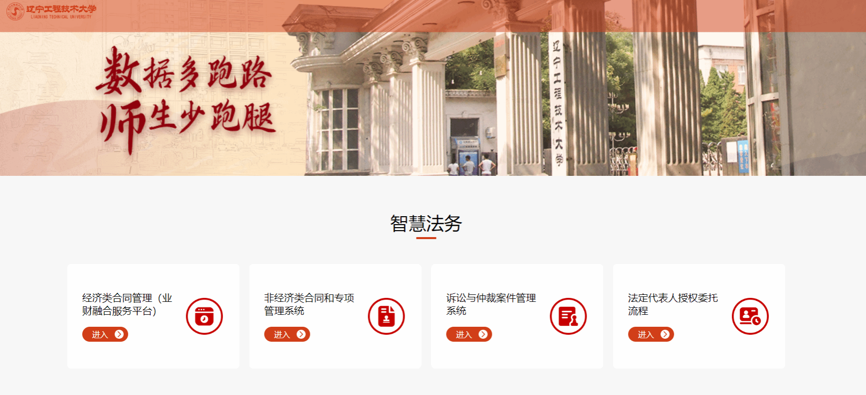 平台深度融合校内多类法务业务,将原分散于门户内业财融合服务平台的经济类合同管理、非经济类合同及专项管理系统、诉讼与仲裁案件管理系统,以及法定代表人授权委托流程统一集成至“智慧法务”模块,实现合同全流程精细化管理、诉讼仲裁案件全节点信息化管理、授权流程规范审批的一站式办理。同时,与办公系统中的规章制度合法性与合规性审查流程协同联动,形成覆盖“经济合同、非经济合同、专项法律事务、诉讼仲裁、授权委托、制度审查”五大核心法务场景+一项制度合规审查的完整闭环,推动法务管理从“分散运行”向“集约智能”升级,为学校治理体系和治理能力现代化提供坚实法治支撑。